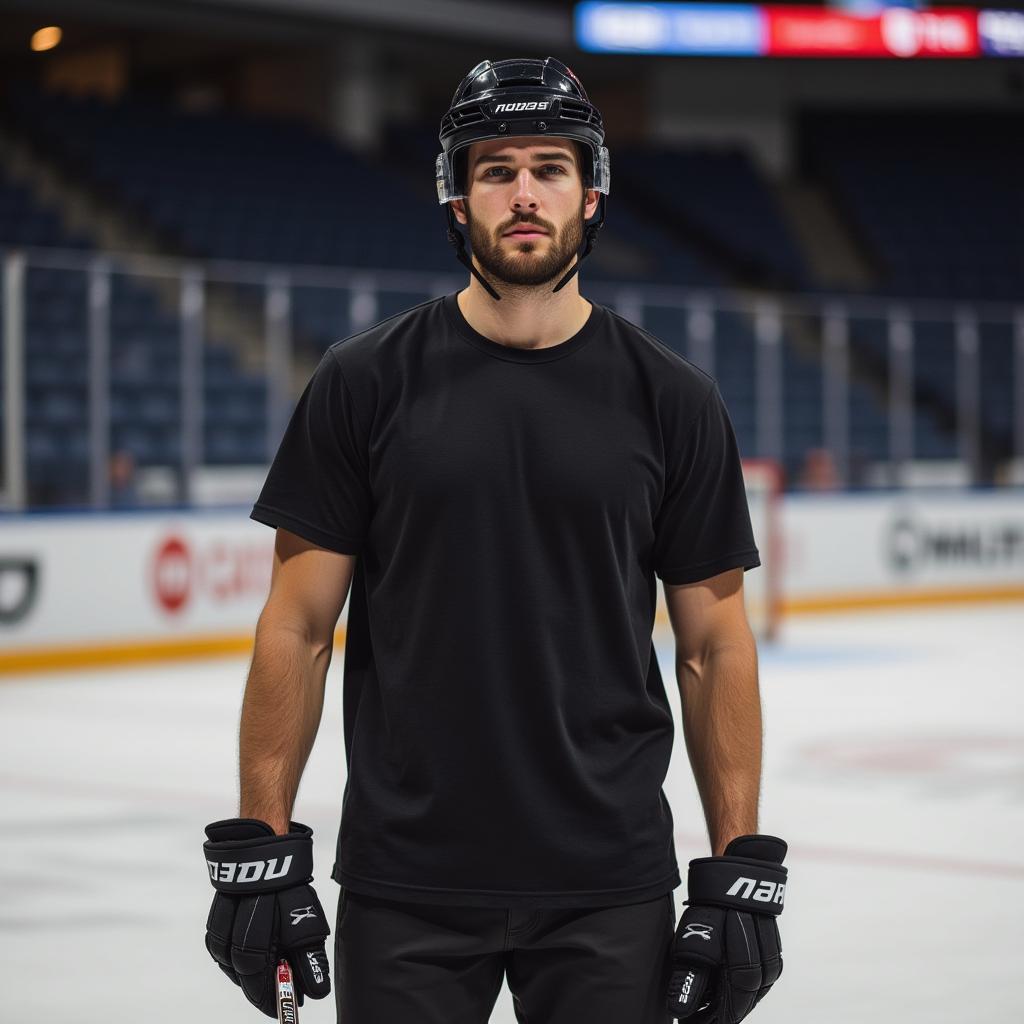 симпатичный русский мужчина 28 лет, с хоккейным шлемом на голове, одет в черную хлопковую базовую футболку. парень стоит анфас к камере на хоккейном льду, внутри стадиона. на ногах у него надеты коньки, а в правой руке он держит хоккейную клюшку. футболку видно полностью. светлая яркая фотография в полный рост с высокой детализацией