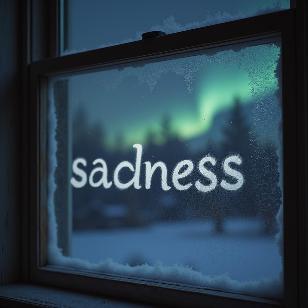 Формат и размер: квадратная обложка 3000×3000 пикселей, Основная сцена: окно с инеем, ночь, Детали окна: на замёрзшем стекле крупными буквами написано слово "ГРУСТЬ" русскими буквами, словно его нарисовали пальцами, стерев иней, Фон: слабое, небольшое северное сияние, мягко освещающее ночное небо за окном, Атмосфера: холодная, мистическая и немного меланхоличная,