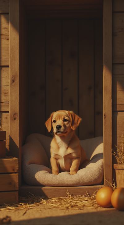 Создайте уютную и теплую сцену, где бездомный пес небольшого размера уютно устроились в будке наполненной мягкой соломой внутри. Добавьте детали: солома, деревянные ящики, . Атмосфера должна быть деревенской, с элементами старинного амбара или фермы. Используйте теплые оттенки коричневого, желтого и бежевого, чтобы подчеркнуть уют и натуральность.