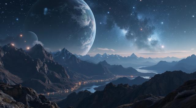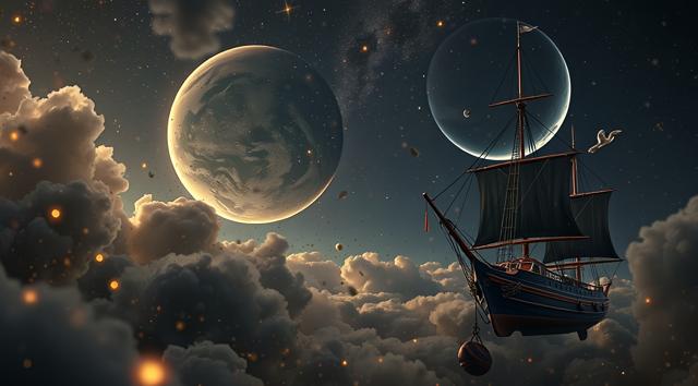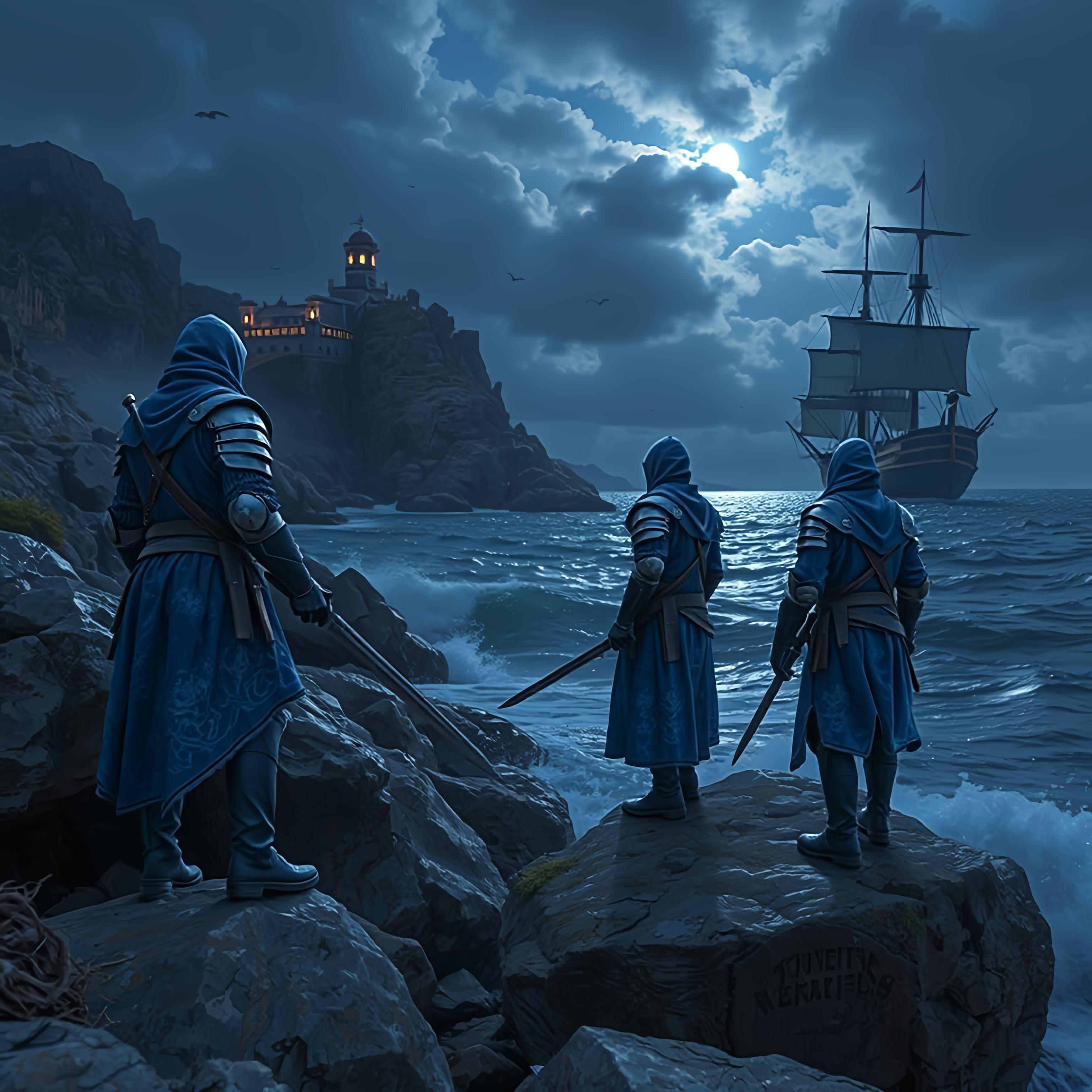 Distant overview of a coastal battle at night: small figures of three Terris warriors in blue‑patterned armor engage a band of pirates on a rocky shore. The focus is on the overall scene rather than individual details — the clash is just one element in a vast, foreboding landscape. Far out to sea, pirate galleons with red sails and black jolly roger flags fade into the mist. Dark fantasy aesthetic, foggy atmosphere, moonlight breaking through clouds, color scheme of deep blue, scarlet, and gray.
