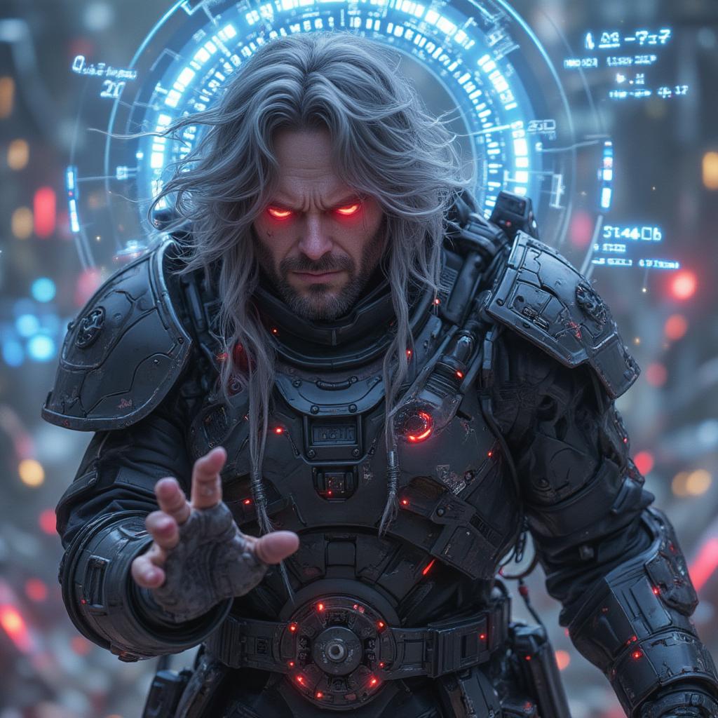 Мультяшный, измученный Техножрец из Warhammer 40k, окруженный парящими голографическими дата-слайдами со статистикой армии и математическими формулами. Он рвет на себе волосы (либо мехадендриты), в то время как на заднем плане простой игрок за Орков счастливо бежит в атаку с ярко окрашенной армией, собранной по принципу «rule of cool». Стиль: яркий, в стиле комикса, преувеличенная мимика.