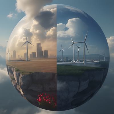 Планета Земля, разделенная на две части, на левой части выжженная пустыня с работающими на ней заводами, на правой части работают ветряные мельницы, и жизнь идёт своим чередом, эмоциональный контраст,, . +Уточнение: Планета Земля, разделенная на две части, на левой части выжженная пустыня с работающими на ней заводами, на правой части работают ветряные мельницы, и жизнь идёт своим чередом, эмоциональный контраст,, . +Уточнение: на левой части сделай более детализованные заводы