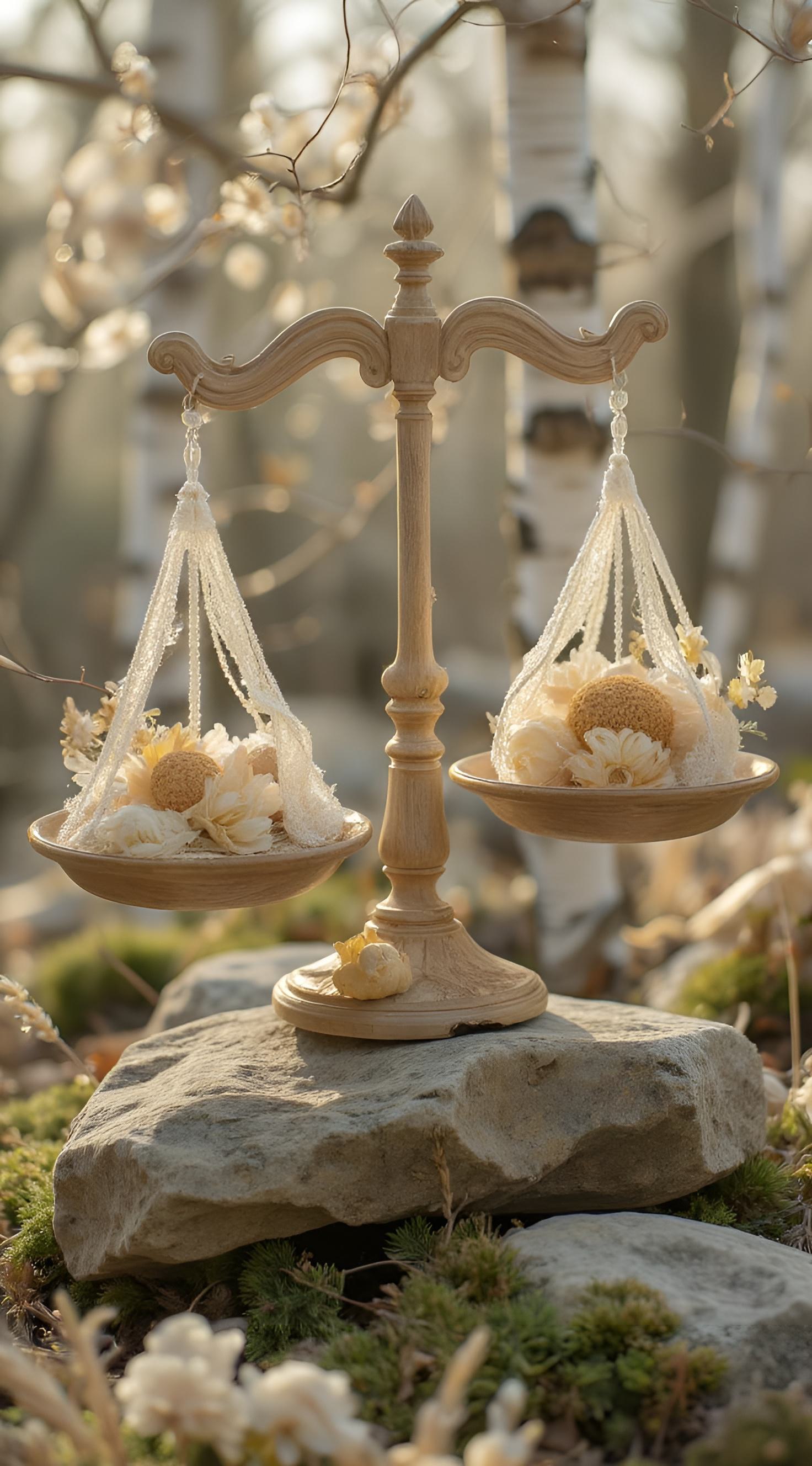 Luminous Autumn Equinox in birch forest. Moss-covered granite boulders as altar base. Wooden scales with autumn symbols on light stone. Slavic white embroidery, wheat, wooden charm. Soft backlight through trees, misty atmosphere. Beige, cream, pale gold palette with moss green accents. Ethereal and peaceful nature spirituality