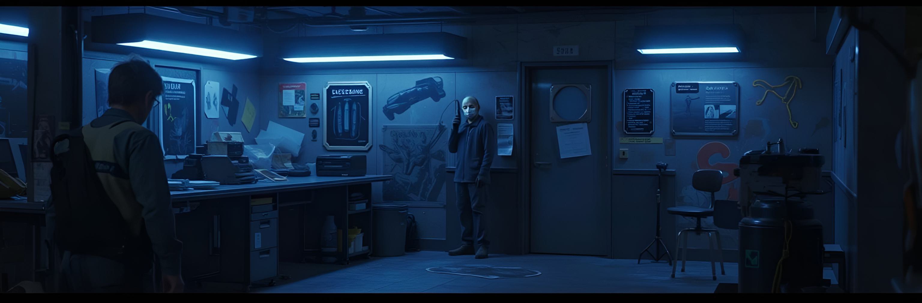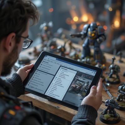 Рука человека застыла в воздухе, тянется к планшету, на котором открыт конструктор армейских списков по Warhammer 40k. В другой руке он держит крашенную миниатюру Космодесанта. На заднем плане на игровом столе стоит красиво окрашенная и основанная армия, готовая к бою, в то время как передний план завален блокнотами, калькуляторами и кружками из-под кофе. Стиль: цифровая живопись, драматичное освещение, акцент на контрасте между параличом на переднем плане и готовностью к игре на заднем