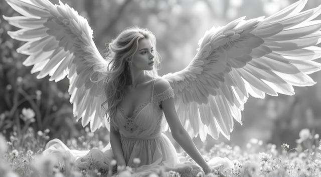 шедевр в стиле Aimee Stewart,Peter McKinnon,фентази,красивая девушка с крыльями в полный рост сидит на земле ,динамика движения,интересный ракурс,живые эмоции,гипердетализация,многослойность изображения,гиперреализм,обьем,ultraHD,фотоживопись,сложный сюжет,прорисовка тушью,игра света и тени,высокое разрешение ,кинематографический кадр, 8к,бимбо
