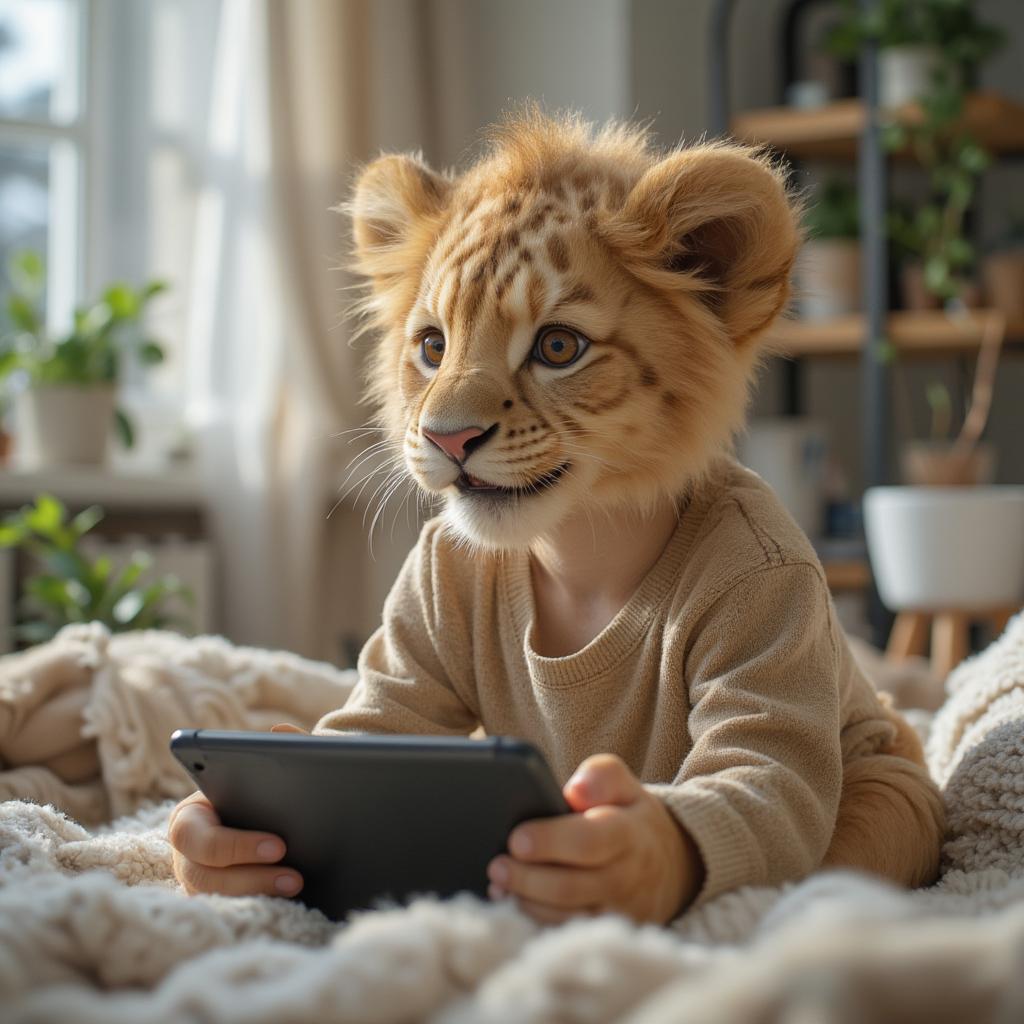 **Shot:** Medium close-up shot of a cheerful young boy with the head of a cute lion cub. He has soft, golden fur and bright, kind eyes. He is sitting comfortably on a soft rug in a sunlit, modern children's room. He is happily playing Minecraft on a tablet, the glow of the screen illuminating his smiling face. The atmosphere is warm, cozy, and magical. Style: hyperrealistic, cinematic lighting, soft focus, 4k.