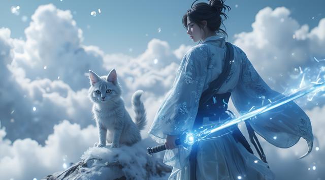 cinematic still, anime key visual, dynamic duo::1.5 -- A serene yet sharp ice samurai (Kento-san) in a traditional japanese robe with frost patterns, holding a glowing katana made of fractal data streams, standing on a floating server rack in the clouds -- Beside him, a smug, mischievous cyber-neko (Glukozavr) with fur that glitches like static TV noise, wearing a tiny stolen neural network chip as a collar, trying to bite the data-katana's tip -- background of floating kanji characters, cherry blossoms that are also binary code, and a giant, elegant API gateway torii gate -- style of studio trigger meets makoto shinkai, ultra detailed, vibrant digital art, luminescent, --ar 16:9 --v 6.0