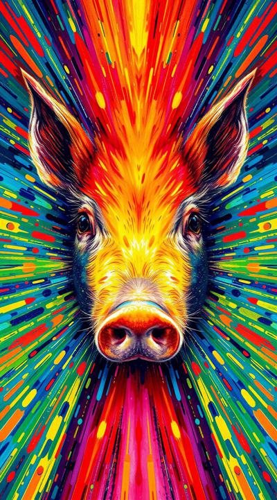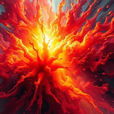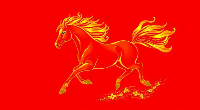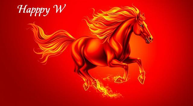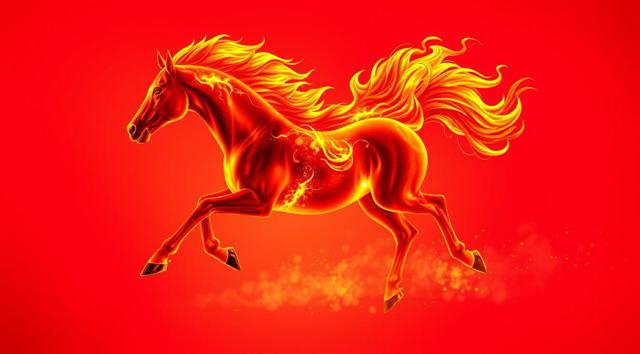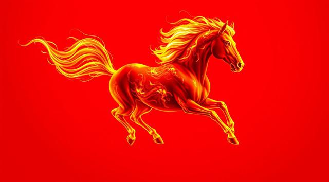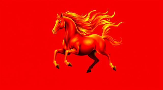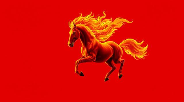 На ярко-красном фоне изображена огненная лошадь, которая скачет вперед. У лошади длинные грива и хвост, состоящие из пламени, которое переливается разными оттенками красного и оранжевого цветов. , Фон равномерно красный, насыщенный, придающий картине праздничное настроение., Дополнительные пожелания: Детализированность изображений, реалистичность огня и ощущение объема предметов.