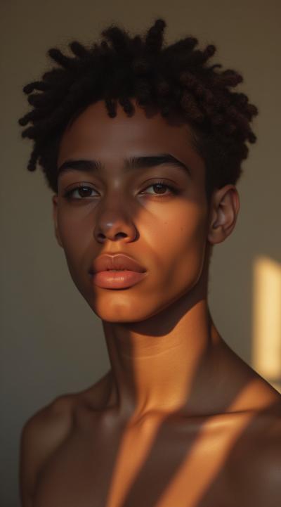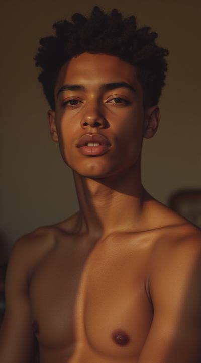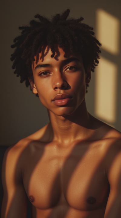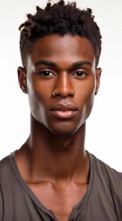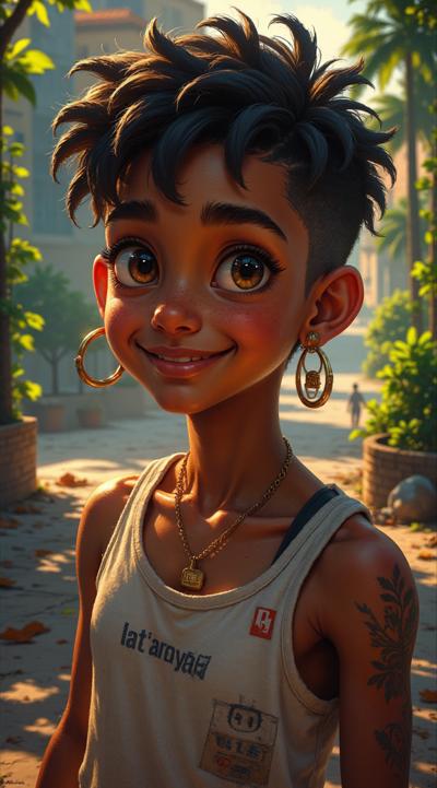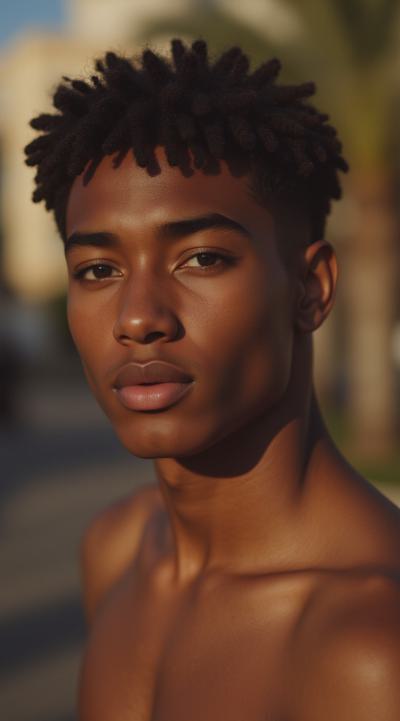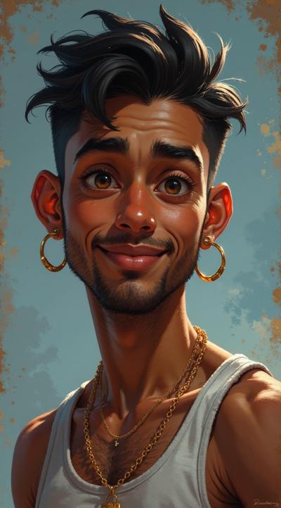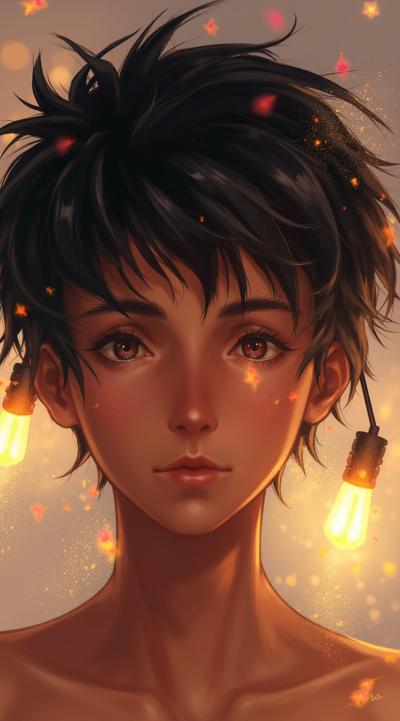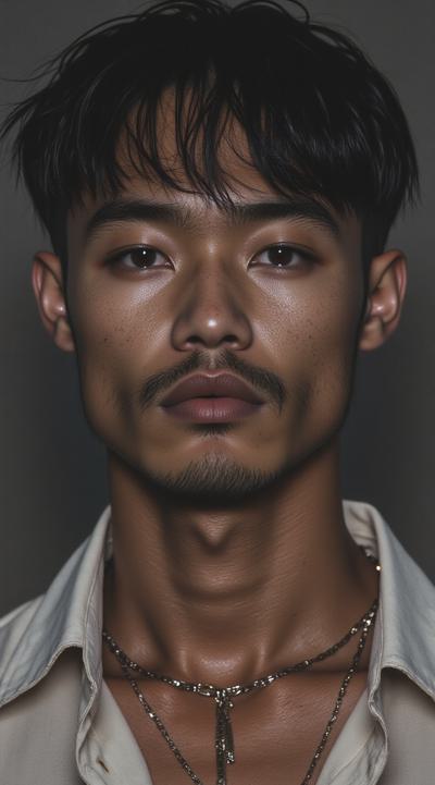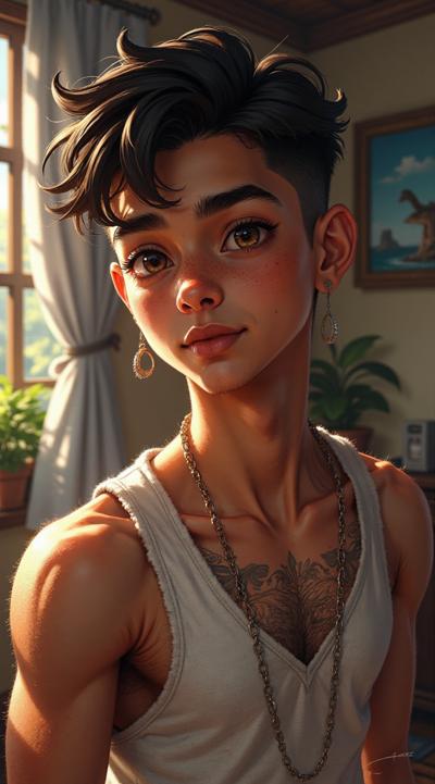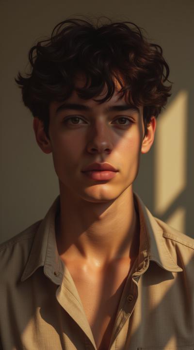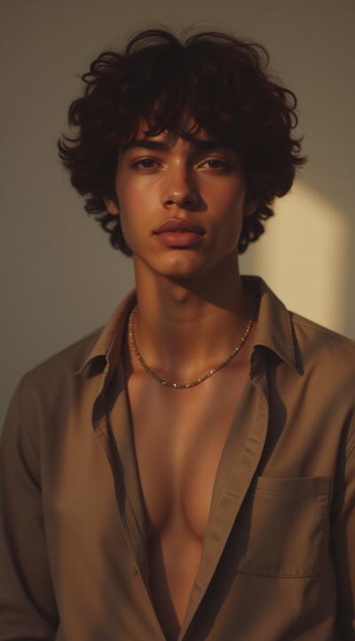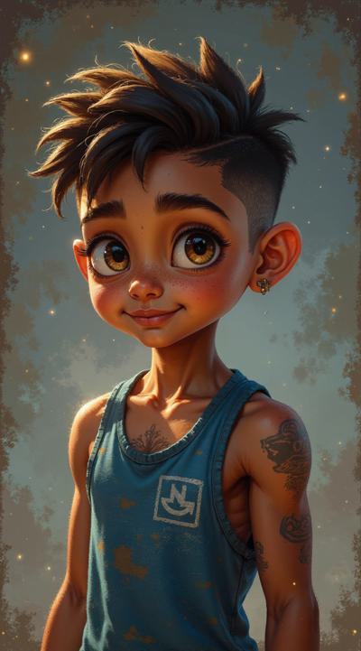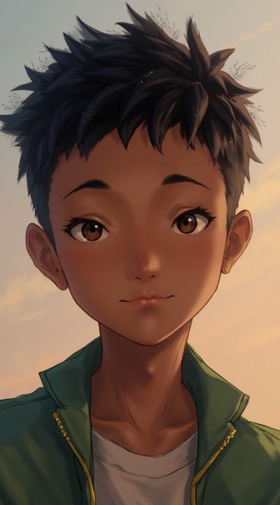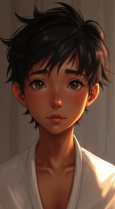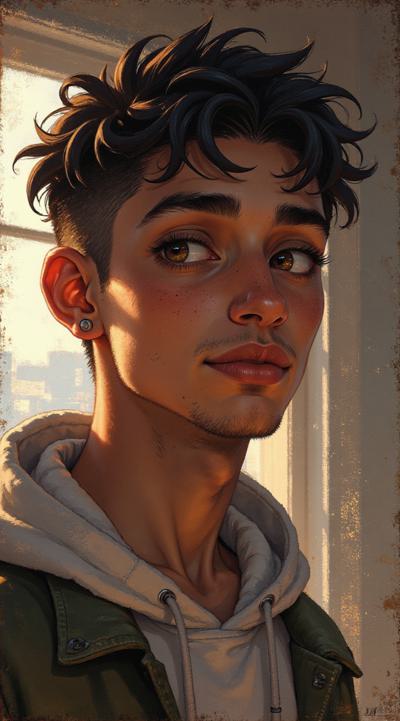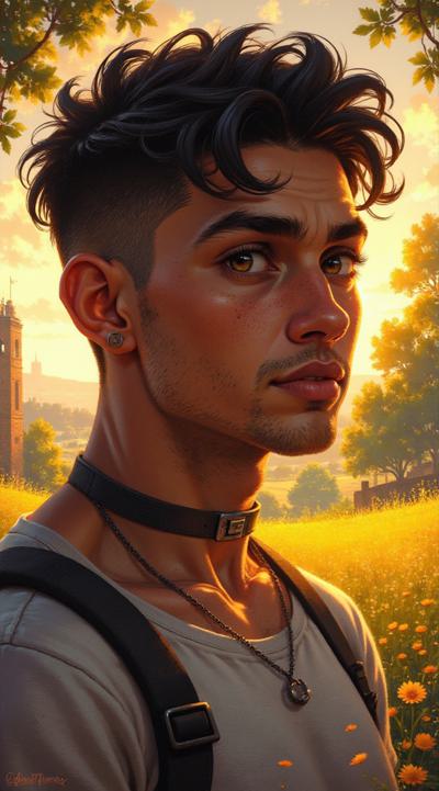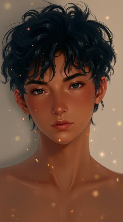 Молодой парень лет 20-25.Телосложение невысокий, худощавый,поджарый,с лёгкой, но крепкой мускулатурой.Кожа смуглая,с лёгким золотистым или оливковым оттенком.Черты лица утончённые, симпатичные, но не броские. Скулы выражены, подбородок чёткий, нос прямой, губы умеренной полноты, часто растянуты в улыбке или усмешке.Глаза самый яркий акцент большие,миндалевидные,золотисто-карие,цвета крепкой чайной заварки. Радужка обведена тёмной каймой, ресницы густые и тёмные.Взгляд живой,выразительный,часто с искоркой иронии или сочувствия.Волосы тёмные (каштановые или почти чёрные), коротко подстрижены,чуть вьются или непослушно падают на лоб.одет просто без изысков в простую мужскую одежду