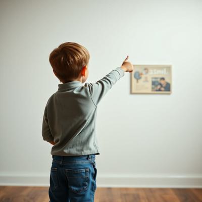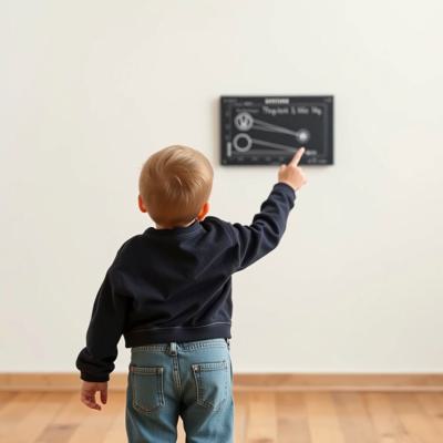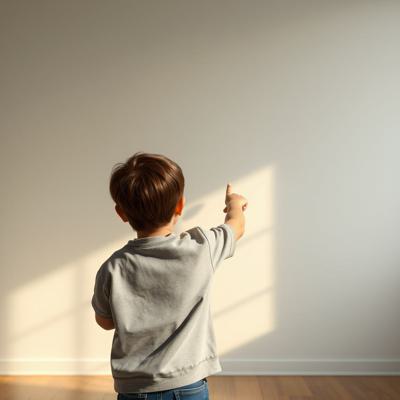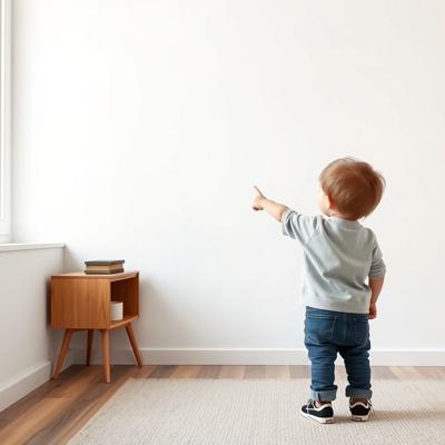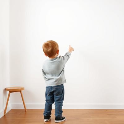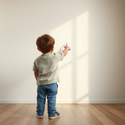 маленький малыш стоит спиной к нам во весь рост в комнате и весело показывает пальчиком на что-то на однотонной стене (стена большая)
