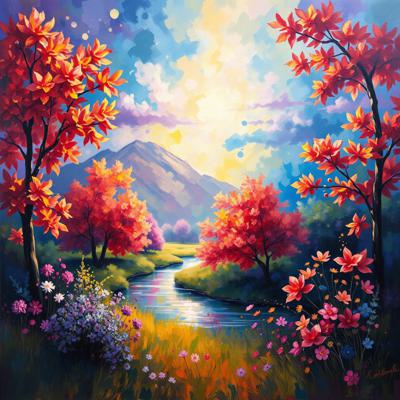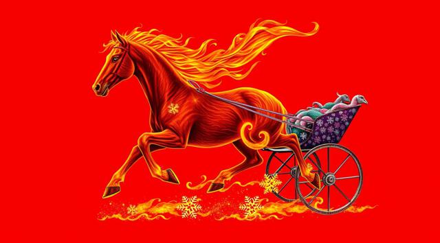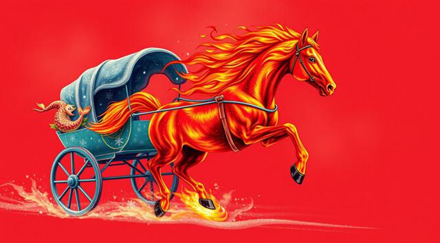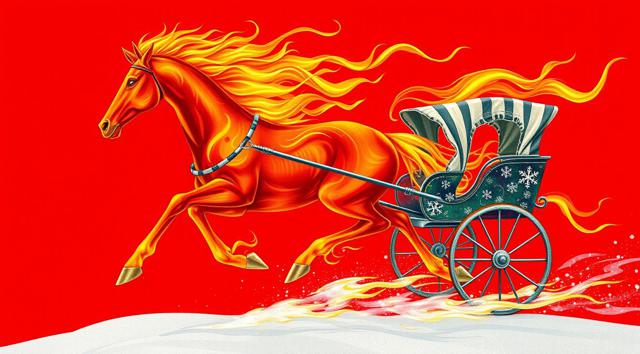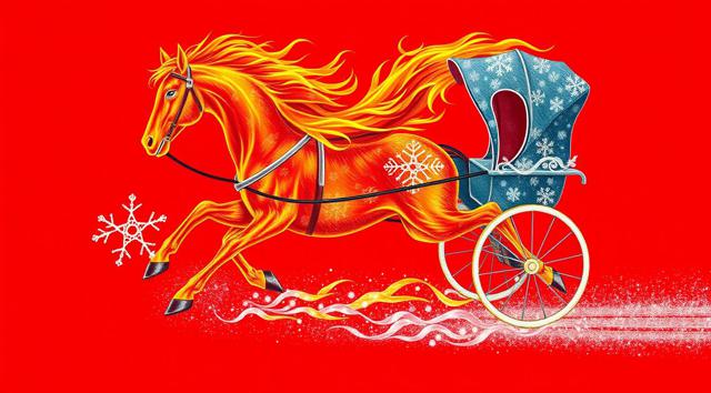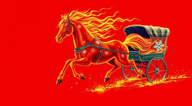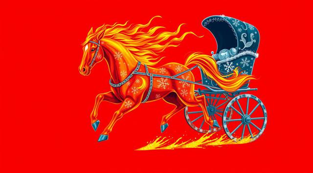 На ярко-красном фоне изображена огненная лошадь, которая скачет вперед. У лошади длинные грива и хвост, состоящие из пламени, которое переливается разными оттенками красного и оранжевого цветов. Под ногами животного бегут языки огня, подчеркивая динамику движения., Тележка украшена снежинками и мерцающими ледяными узорами. Внутри телеги аккуратно уложены большие сахарные рожки мороженного классического белого цвета с капельками сиропа, сверкающего золотистыми бликами., Фон равномерно красный, насыщенный, придающий картине праздничное настроение., Дополнительные пожелания: Детализированность изображений, реалистичность огня и ощущение объема предметов.