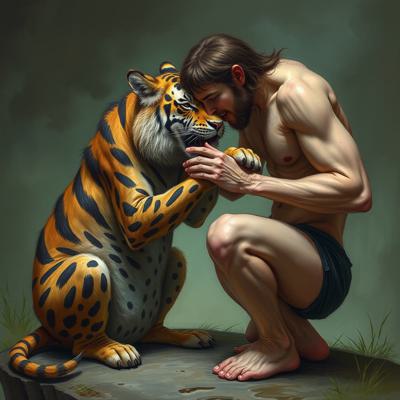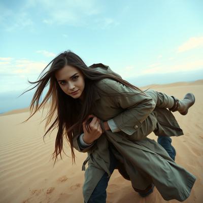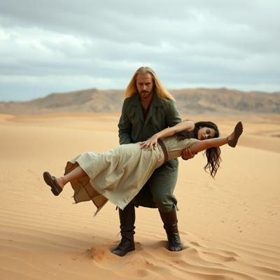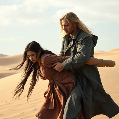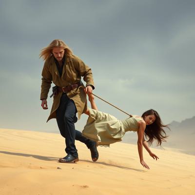 Мужчина с длинными светлыми волосами, одет в плащ, тащит за шиворот одежды девушку 20 лет, с длинными темно-русыми волосами по песку в пустыне , фэнтези