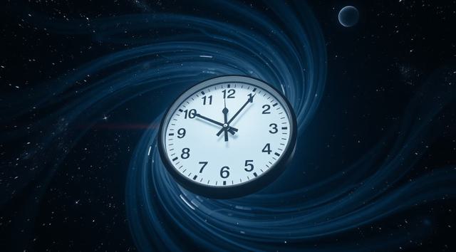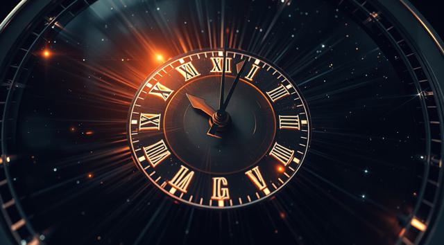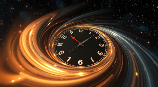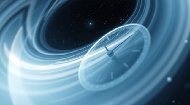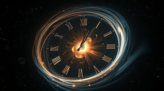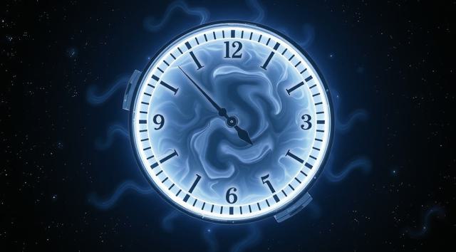 Космос. Замедленное вращение часов из света, стрелки тянутся как жидкость, звёзды искривляются в пространстве.