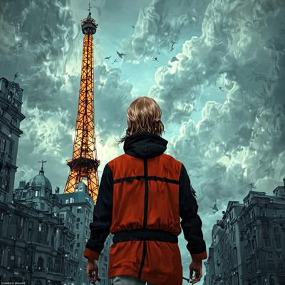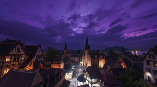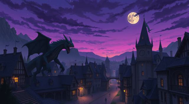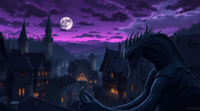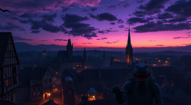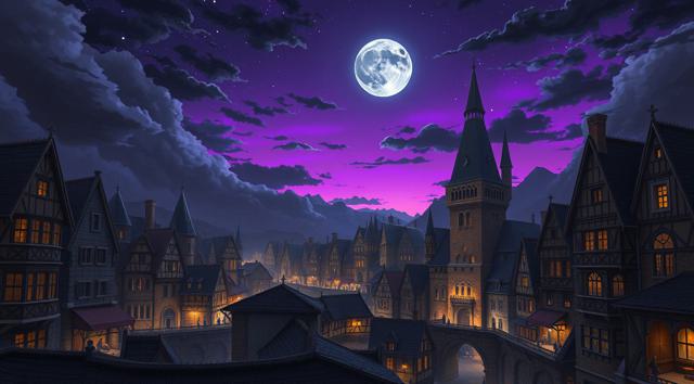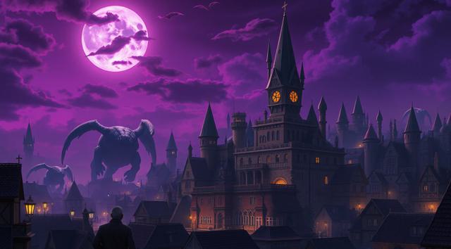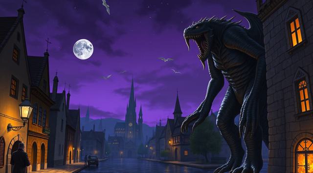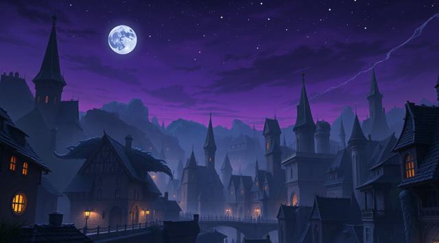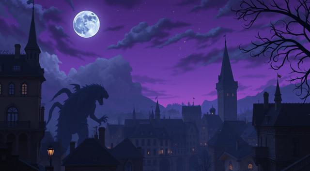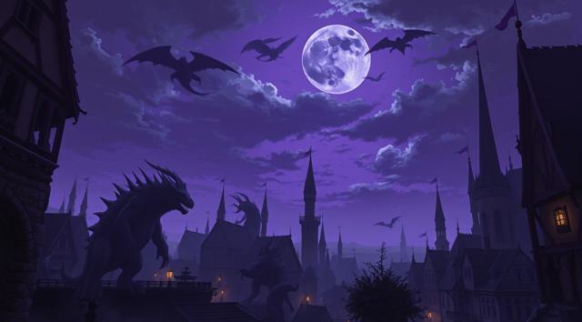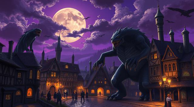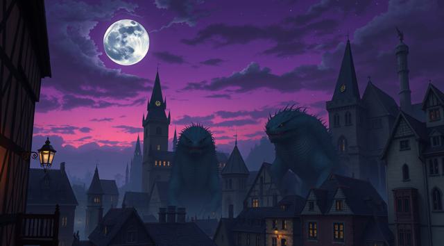 Ночь с фиолетовым небом, средневековый, европейский город с монстрами, похожими на людей