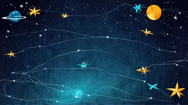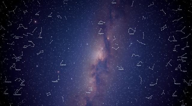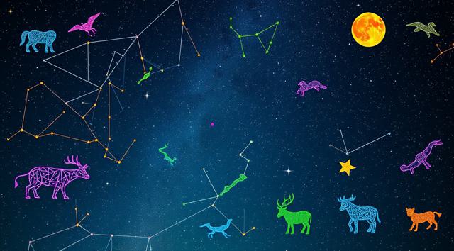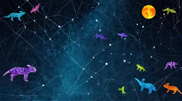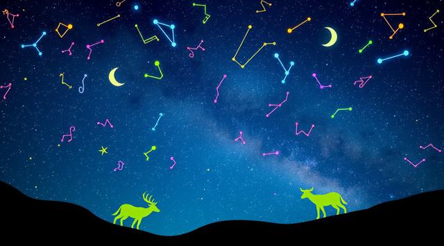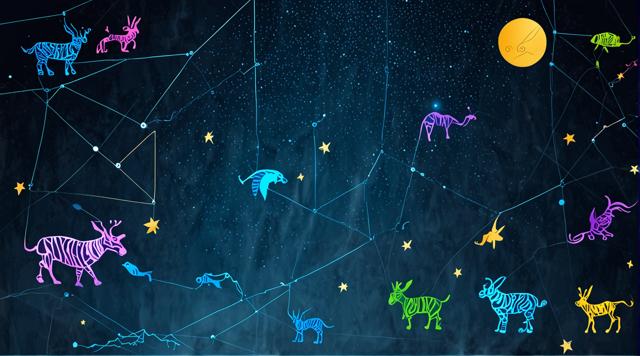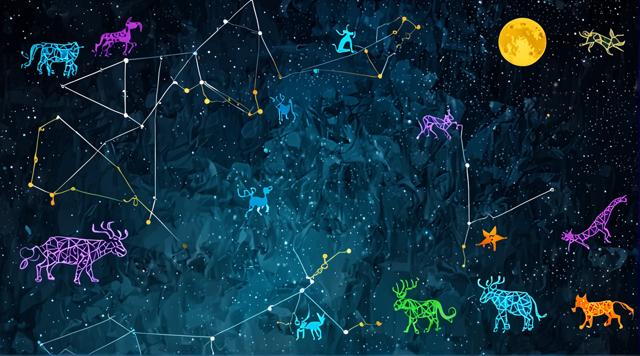 нарисуй красочные созвездия на небе изобразив в том числе животных из этих созвездий