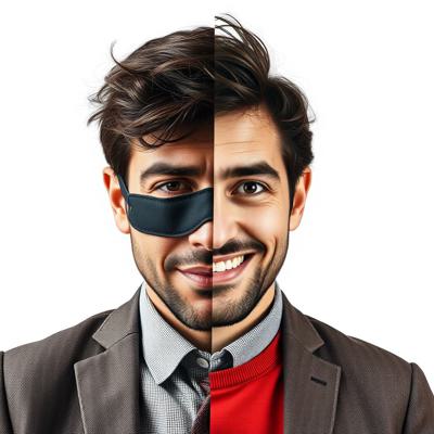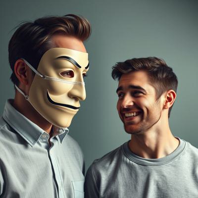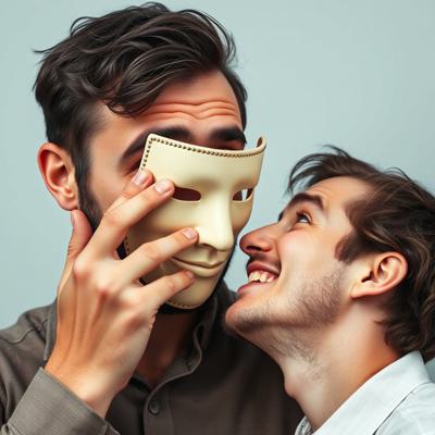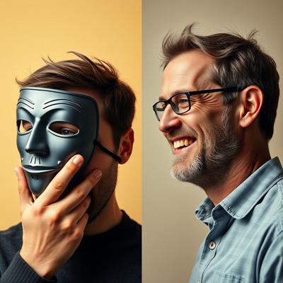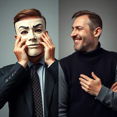 Половина картинки человек, примеряюший маску, страдающий от лицемерия, на второй половине картинки счастливый добрый честный человек, они смотрят друг на друга, вся картинка объелинена в один сюжет