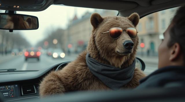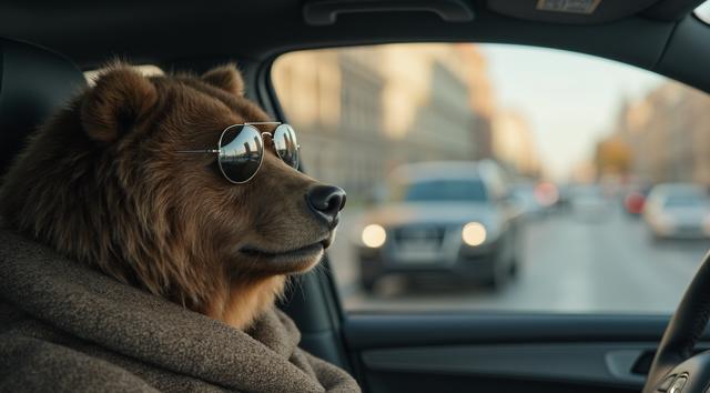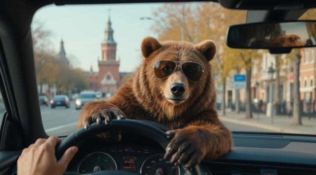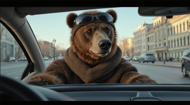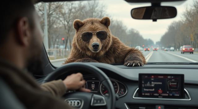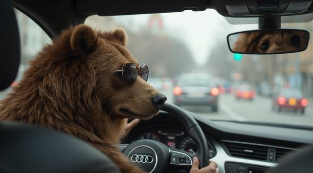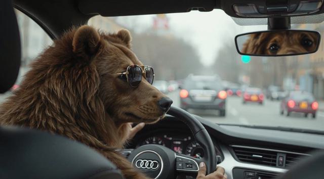 Audi А4 коричневого цвета едет по Москве, за рулем бурый медведь в солнцезащитных очках-авиаторах, вид-5 метров перед машиной, слегка повернуто на водителя