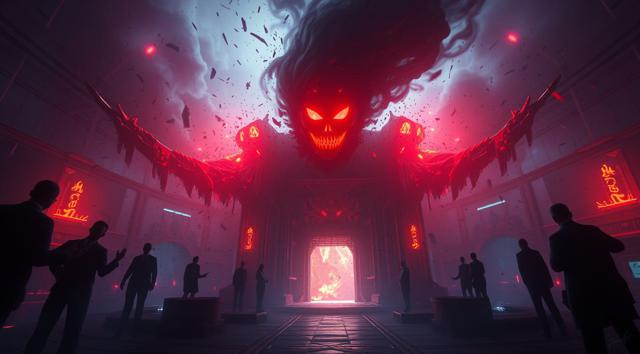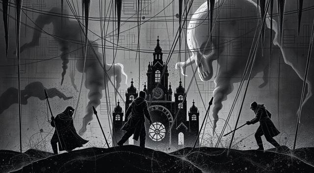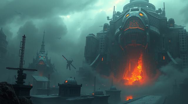 Древнегреческий ксеноморф в доспехах гладиатора похожих на эндоскелет на фоне древних руин храма на земле раскиданы черепа