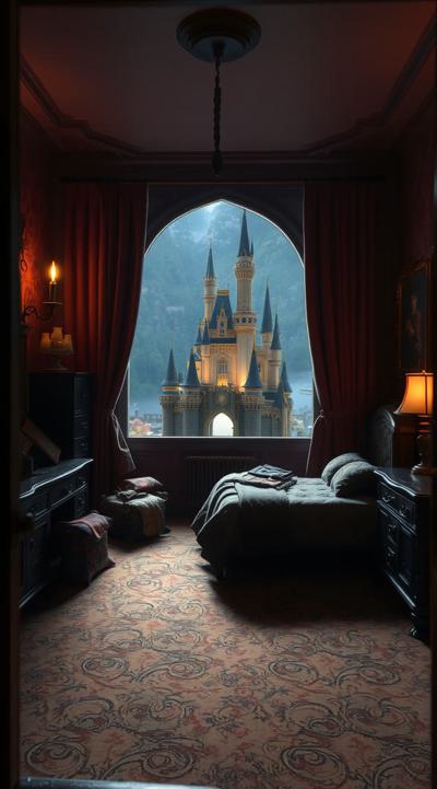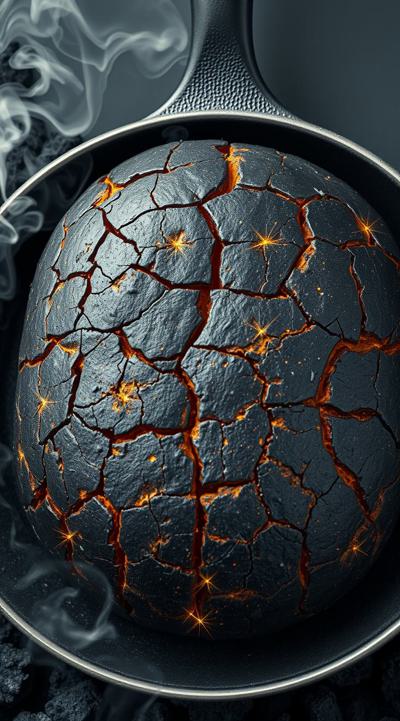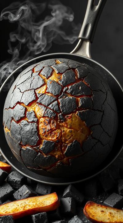В центре кадра — гигантская обугленная картофелина с глубокими трещинами, занимающая 2 3 пространства. Кастрюля опрокинута, её край задран вверх. Картофель чёрный, покрыт пеплом и копотью, с обугленными краями и искрами из трещин., , По бокам — контрастные элементы: слева веселое облачко пара, справа — грозный столб дыма. Тёмный фон с синеватым оттенком и верхний свет создают драматичные тени., , Поверхность картофеля шероховатая, с эффектом горелой корки, а старая кастрюля усиливает трагикомичный эффект. Диагональная композиция, летящий пепел и искры добавляют динамики.