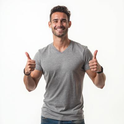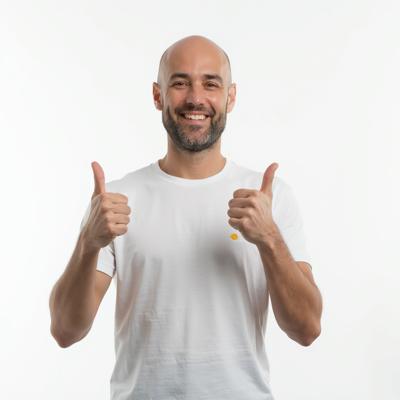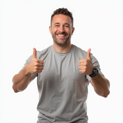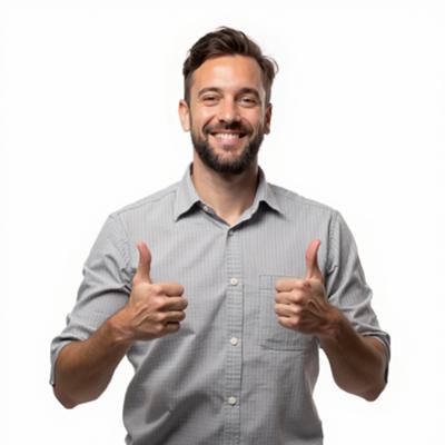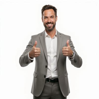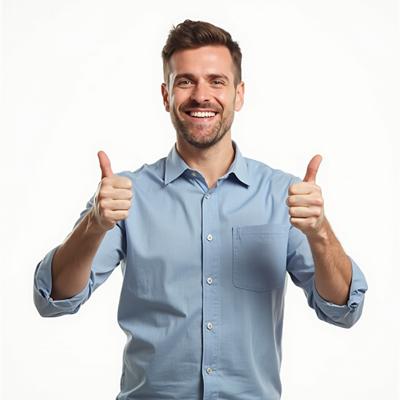 Молодец человек стоит на белом фоне и улыбается, показывает знак класс (палец вверх) двумя руками