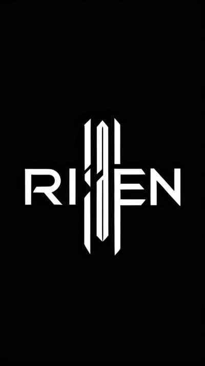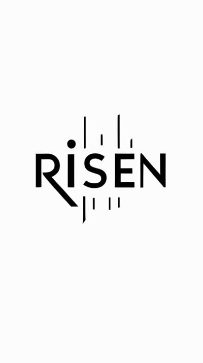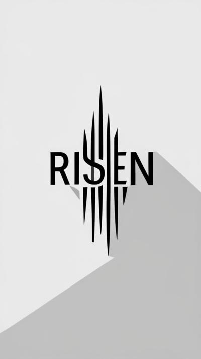 Pekpytvertical inscription RISEN , the inscription risen vertically in capital letters, black and white