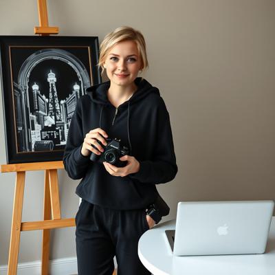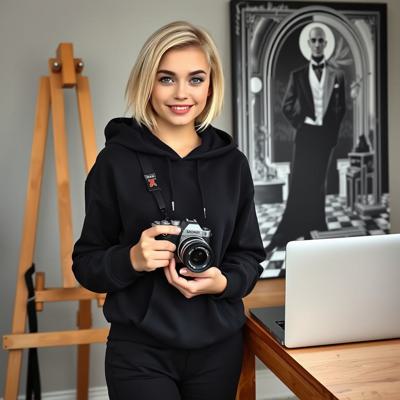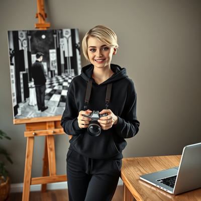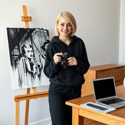 Красивая молодая блондинка с курносым носом, голубыми глазами улыбается и короткой стрижкой, одетая в черную толстовку и брюки, держит в руках фотоаппарат, возле неё стоит мольберт с нарисованной черно-белой картиной в стиле Гэтсби, справа стоит стол с открытым ноутбуком