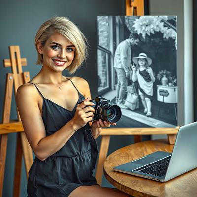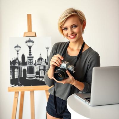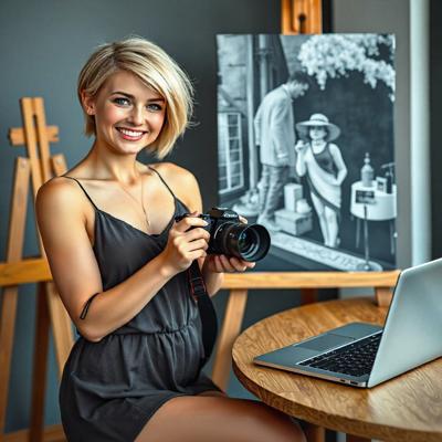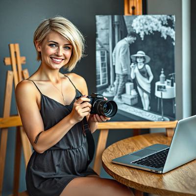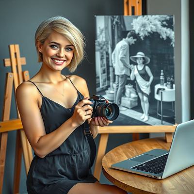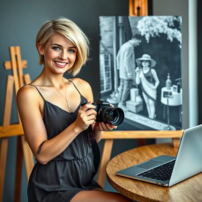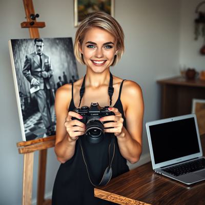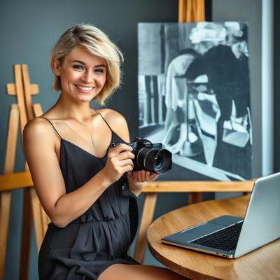 Красивая молодая блондинка с короткими волосами и голубыми глазами улыбается и держит в руках фотоаппарат, возле неё стоит мольберт с нарисованной черно-белой картиной в стиле Гэтсби, справа стоит стол с открытым ноутбуком [Вариации для #5921482 ]