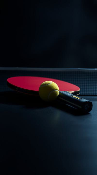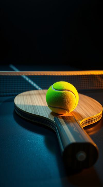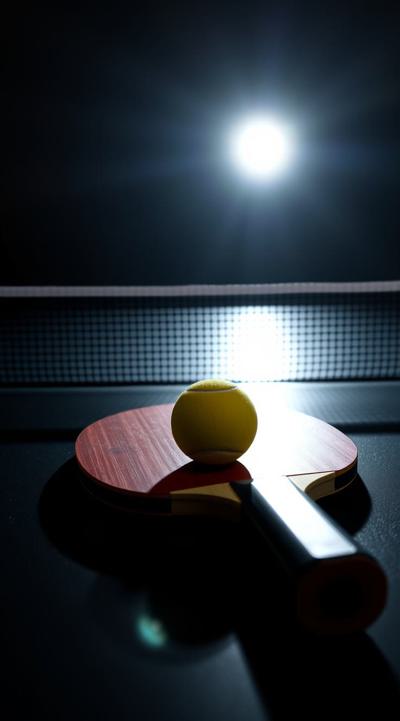 Ракетка для настольного тенниса лежит на столе на ней теннисный мячик. Темный фон, свечение