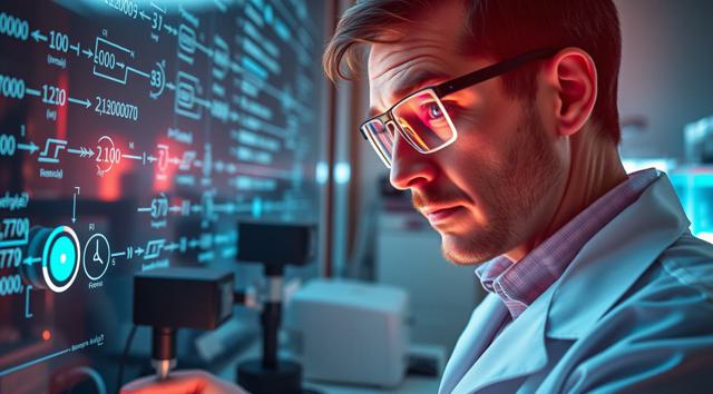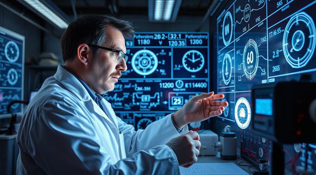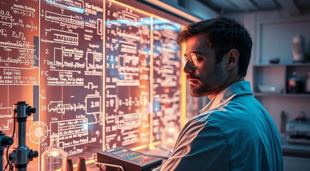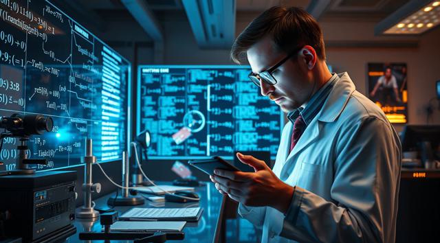 Учёный Алексей в лаборатории смотрит на голографические формулы. На стенах отражаются колебания времени, приборы излучают световые волны.