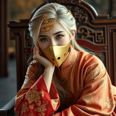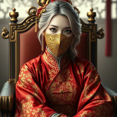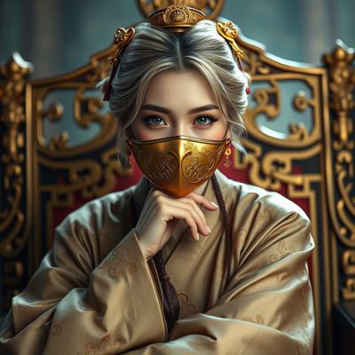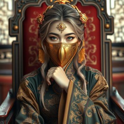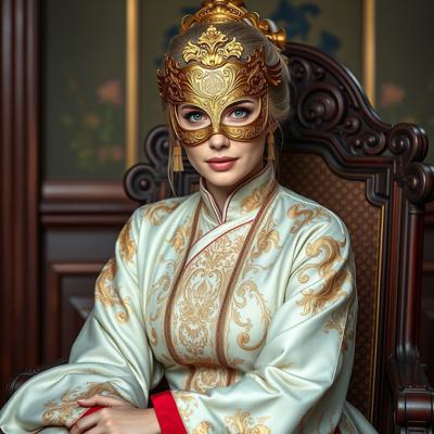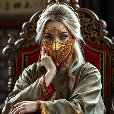 красивая нежная женщина с белокуро-пепельными волосами,зелёными глазами, круглым лицом и курносым носом в китайских императорских одеждах расшитых золотом, с красивой маской сделанной из золота похожей на те что в китайских фильмах закрывающей верхнюю часть лица сидящая на троне опёршись локтём о подлокотник и подставив эту руку под голову