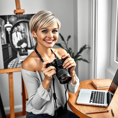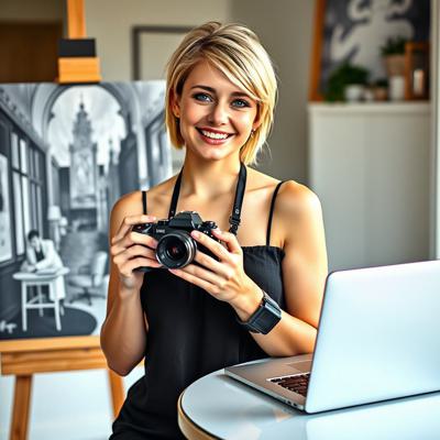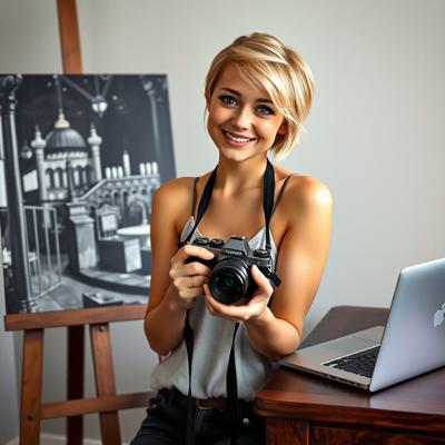 Красивая молодая блондинка с короткими волосами и голубыми глазами улыбается и держит в руках фотоаппарат, возле неё стоит мольберт с нарисованной черно-белой картиной в стиле Гэтсби, справа стоит стол с открытым ноутбуком