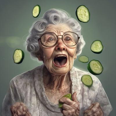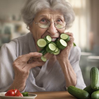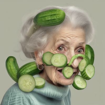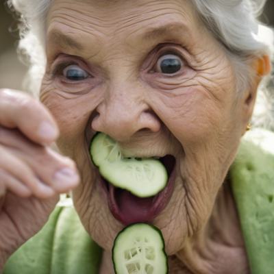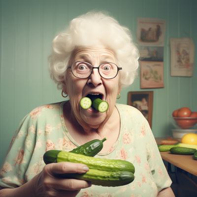 Обосраная бабушка с полным ртом огурцов во рту