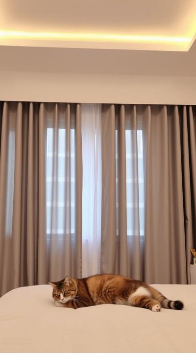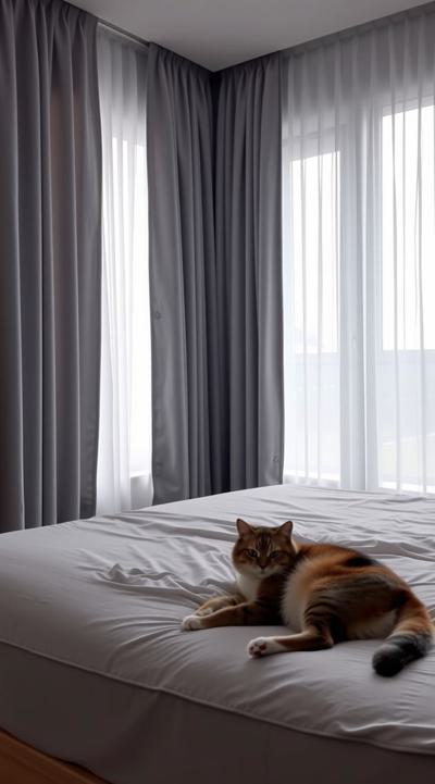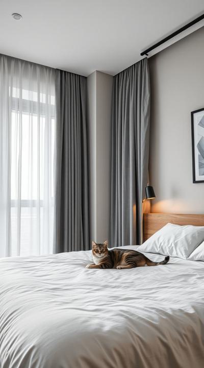 современный интерьер спальни серые шторы кровать на ней лежит кот