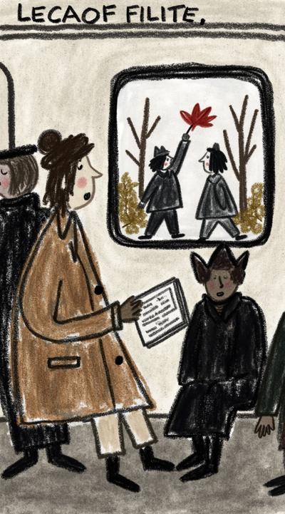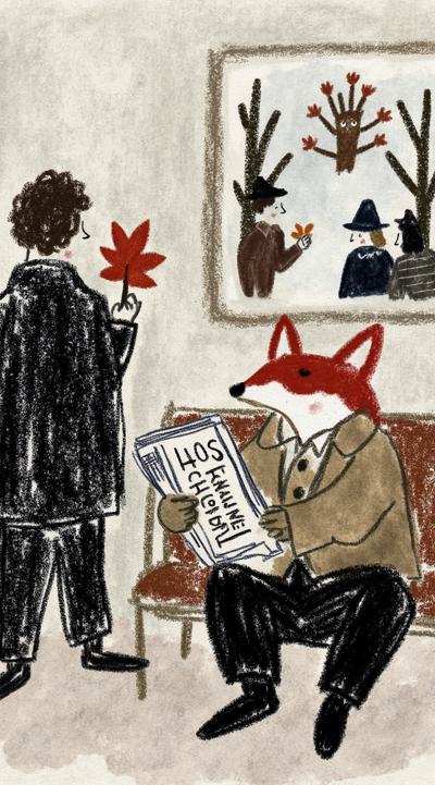 Лиса в тренче сидит в подземке, держит газету “Последний поезд”. Остальные пассажиры — размытые тени. В отражении на окне — она ребёнком бежит по осеннему лесу. Между лап — одна красная осенняя листва. Стиль филм-нуар, сюрреализм, меланхолия, чёрно-белое с одной красной деталью, кинематографично, 4K,