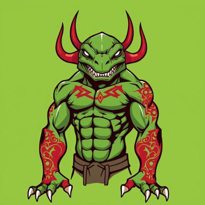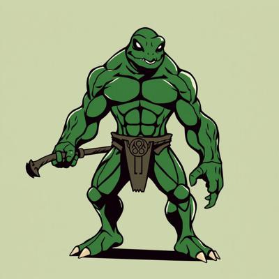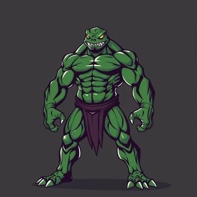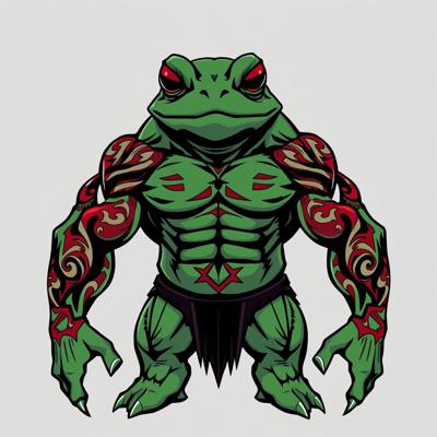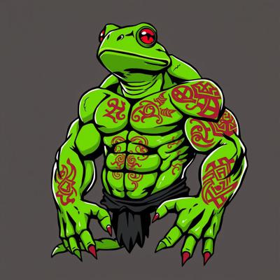 a stylized muscul brutal - humanoid toad warrior: simplified geometric form, bold green color with black outlines, minimal details. Tattoos as abstract shapes and symbols in red and white, covering the arms and torso. The character stands in a powerful pose, one hand on hip. Clean lines, flat colors, modern fantasy illustration, high contrast.», Choose the one that best fits your vision, or mix elements