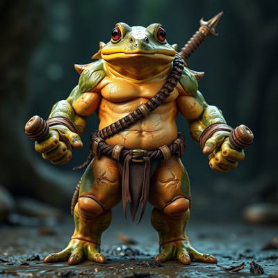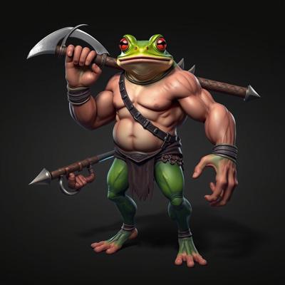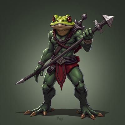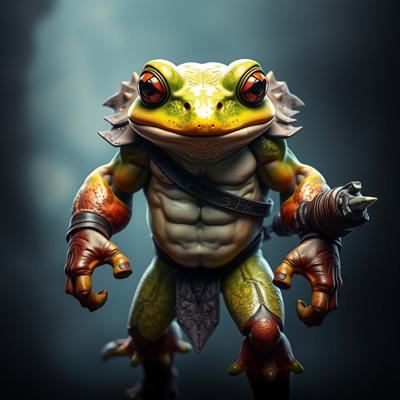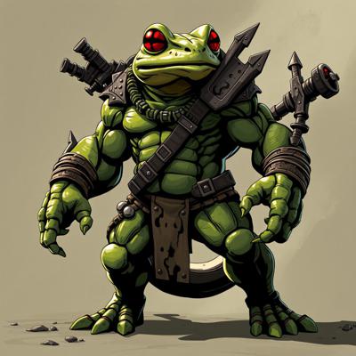 a stylized muscul brutal - humanoid frog warrior: The character stands in a powerful pose. Strong, cool, realistic