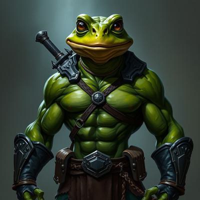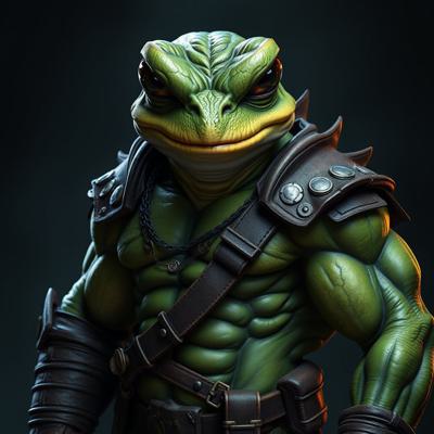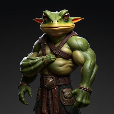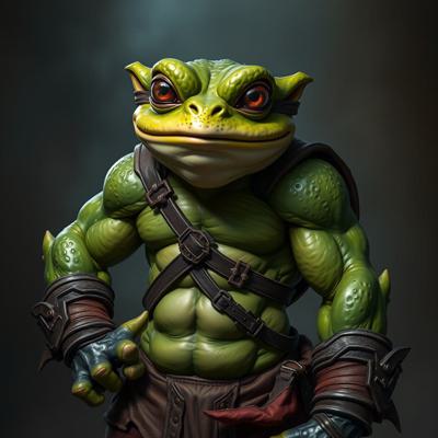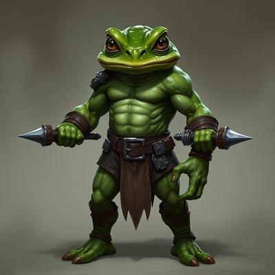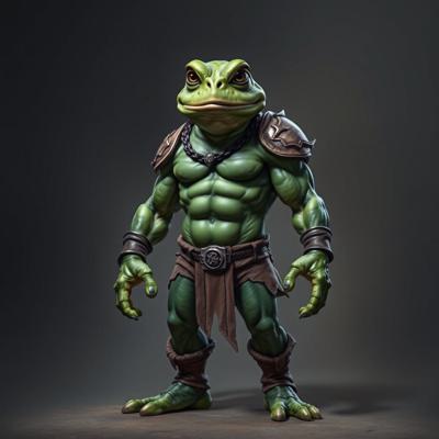гуманойдная жаба воин, фэнтези. Стоит в уверенной позе, мускулистый, рельефное тело, темно зеленый оттенок, глаза смотрят четко в кадр. Слегка криминальный внещний вид. Средневековье