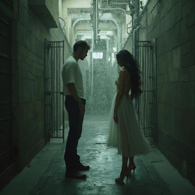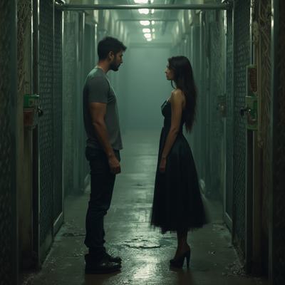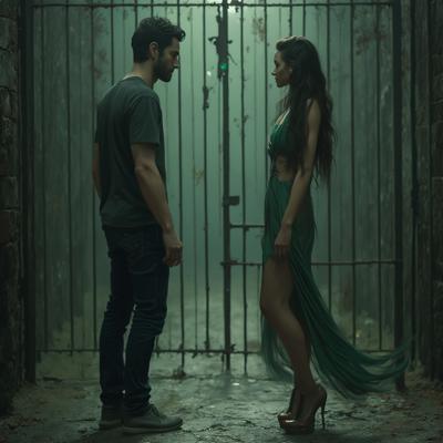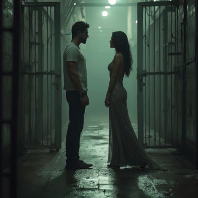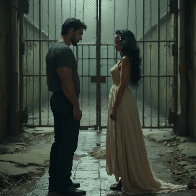 Возле тюремных ворот темноволосый мужчина в темных джинсах и футболке замирает перед женщиной в изящном платье на каблуках с длинными темными волосами и зелеными глазами., * Язык тела: Он может выглядеть напряженным, словно готовым к удару или бегству, в то время как она олицетворяет всё то, что он потерял за 16 лет., * Эмоциональный пик: Тот самый момент, когда взгляд падает на её каблуки и открытые плечи, вызывая у героя тот «первобытный» внутренний бунт
