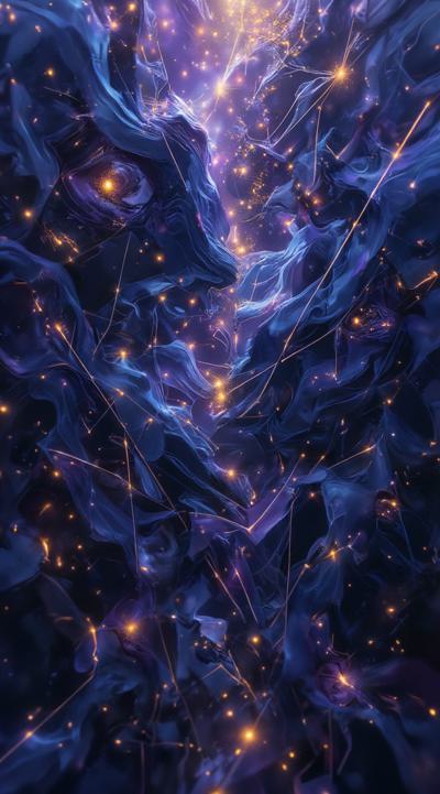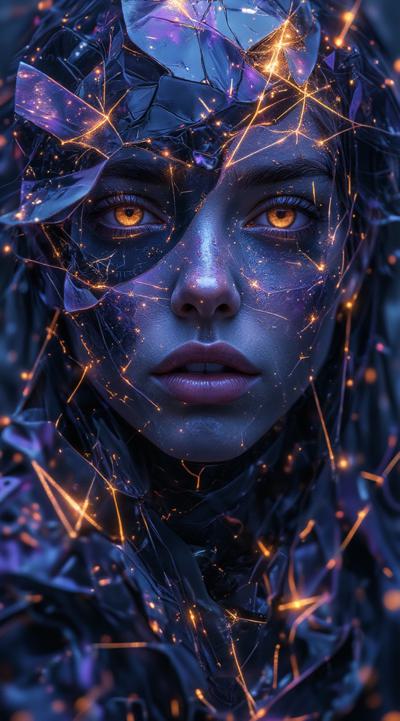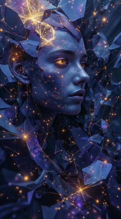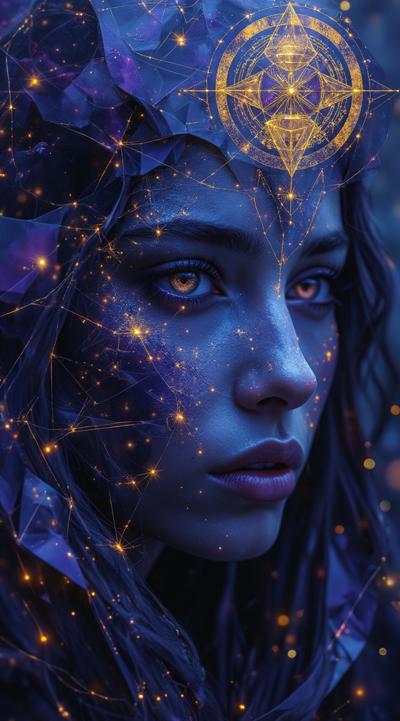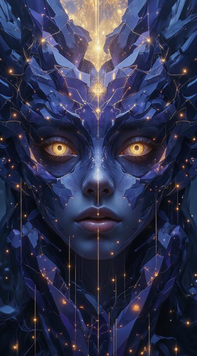 Abstract cubist composition, esoteric mystical atmosphere, fragmented geometric planes in dark blue, deep purple and gold tones, sharp angular shapes overlapping, subtle hints of runic symbols dissolved into the geometry, energy lines cutting through the forms, hidden eyes or faces barely suggested in the fractured planes, moody lighting with golden highlights, digital art style, high contrast, no literal objects, pure abstract mystical geometry. добавь золотые надписи руническом шрифтом
