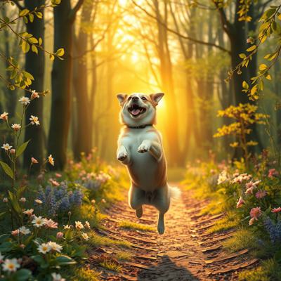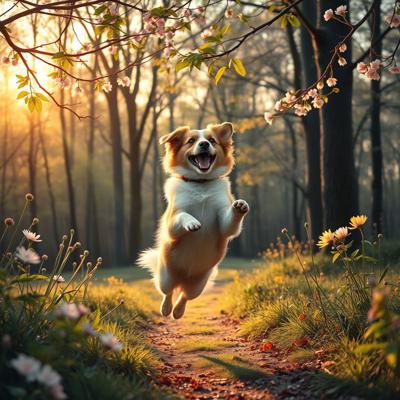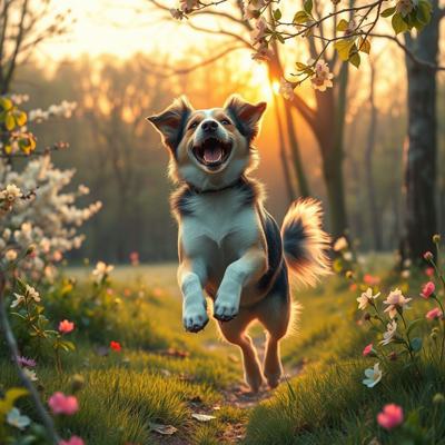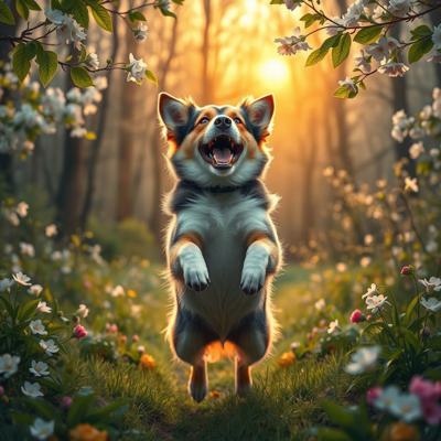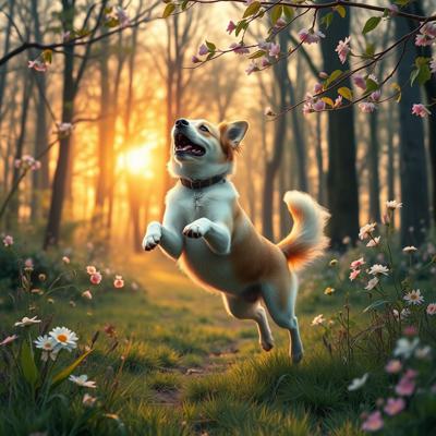 Собака прыгает и радуется, вокруг распускаются цветы и листья деревьев, на фоне весеннего леса, на восходе солнца, в реалистичном стиле.