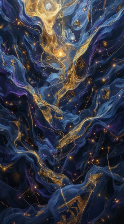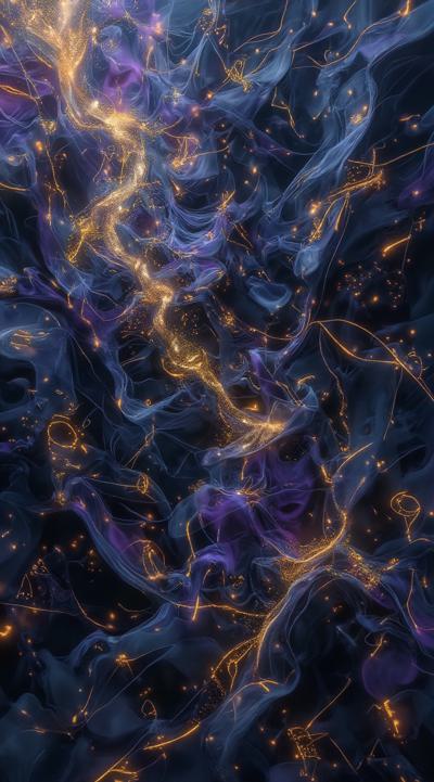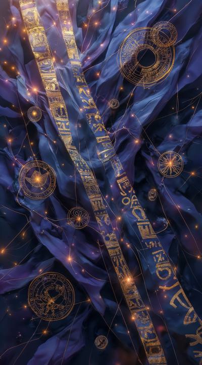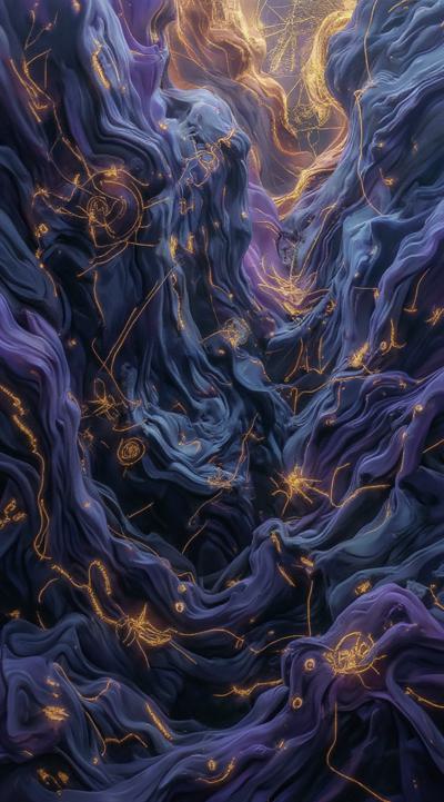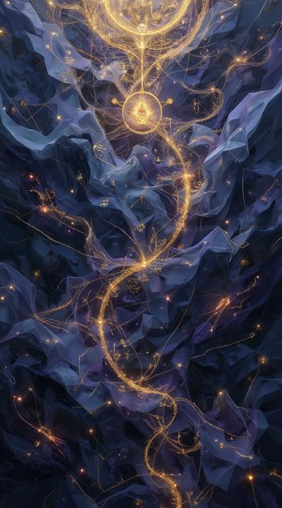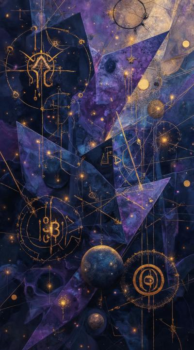 Золотые рунические надписи в разных плоскостях и направлениях на следующем фоне: Abstract cubist composition, esoteric mystical atmosphere, fragmented geometric planes in dark blue, deep purple and gold tones, sharp angular shapes overlapping, subtle hints of runic symbols dissolved into the geometry, energy lines cutting through the forms, hidden eyes or faces barely suggested in the fractured planes, moody lighting with golden highlights, digital art style, high contrast, no literal objects, pure abstract mystical geometry.