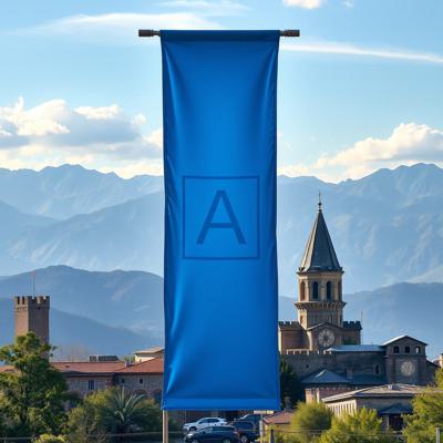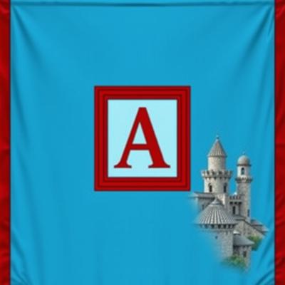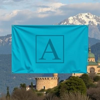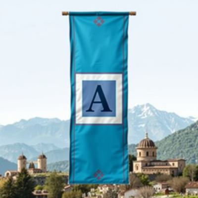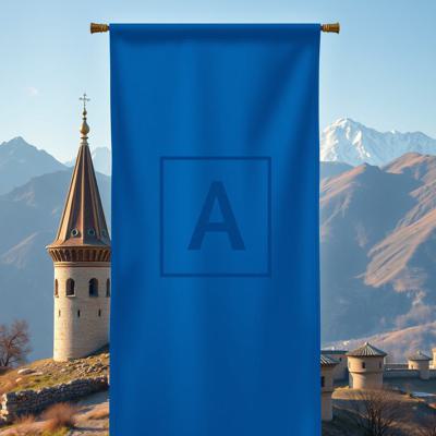 Вертикальное голубовато- синее знамя в центре квадрат и по середине большая буква А на фоне старинных башен Кавказа и кавказских гор