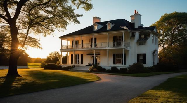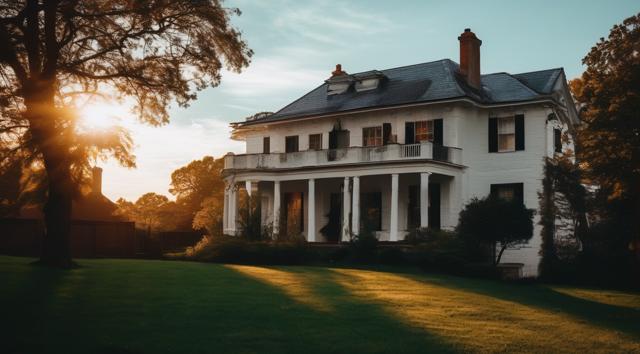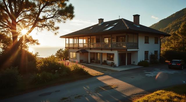 Здание Маленького частного отеля современного, но закрытого из-за нерентабельности. Расположенный лесистой горной местности близь моря. Рассвет. [Вариации (0.9) для #6319441 [Качество x3 ]]