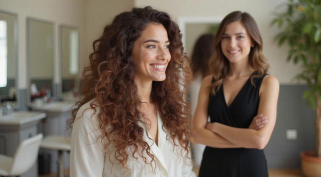 смотрит в сторону, рядом стоит стилист, женщина, фон размытый, [Уточнение для #6323251 'девушка в салоне после биозавивки волос, с красивыми кудрями ]'