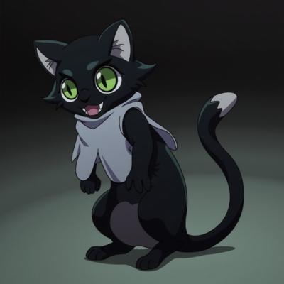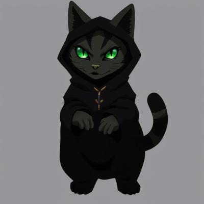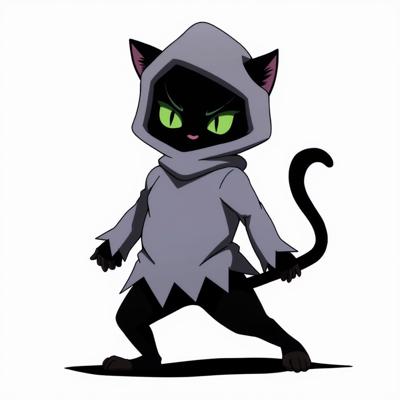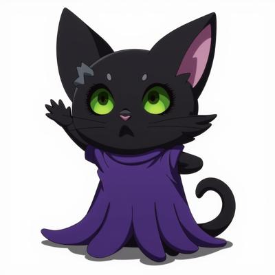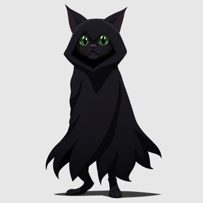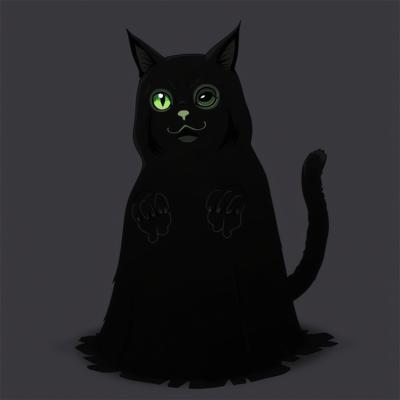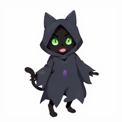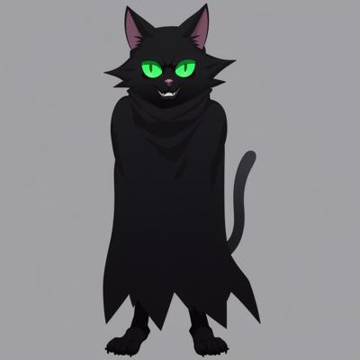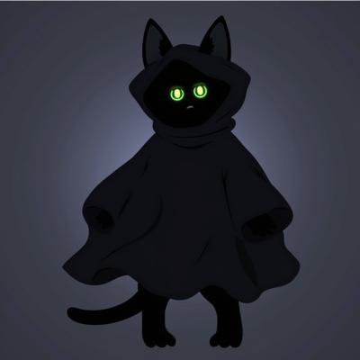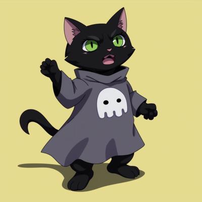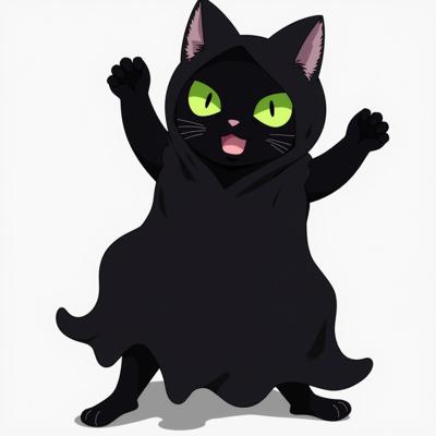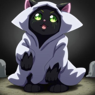 Черный кот с зелеными глазами стоит прямо на задних лапках и в костюме приведения