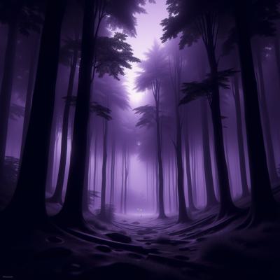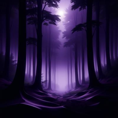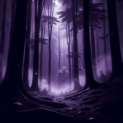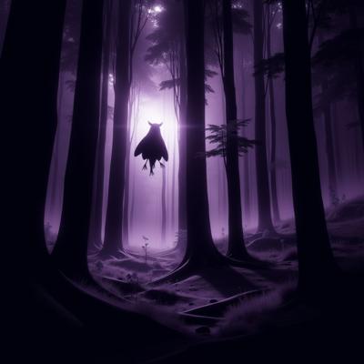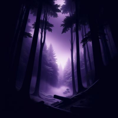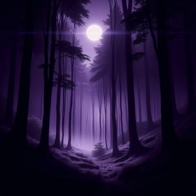 Темный лес в фиолетовых тонах с нотками черного и белого. Из леса вылетают приведения