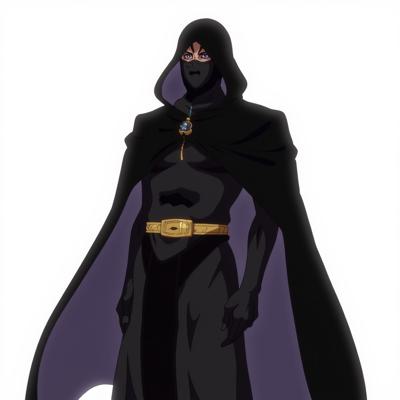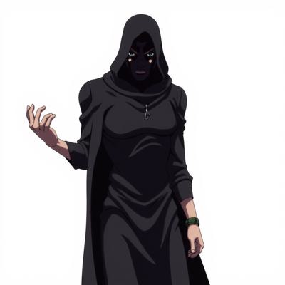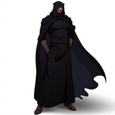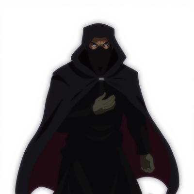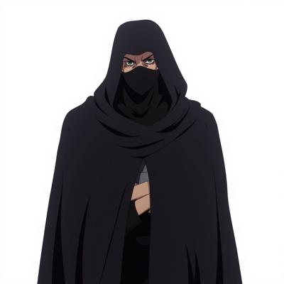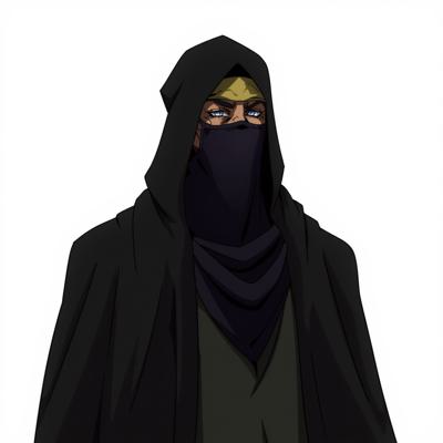 Мужчина в черной одежде и капишоне что закрывает полностью лицо, в арабской одежде и похож на авантюриста на белом фоне