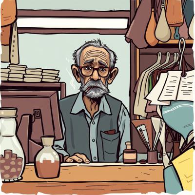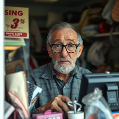 Худой старик заа кассовым аппаратом. Старые перекошенгый очки, небритый, седая короткая борода, сигарета. Вокруг товар женский секондхенд.