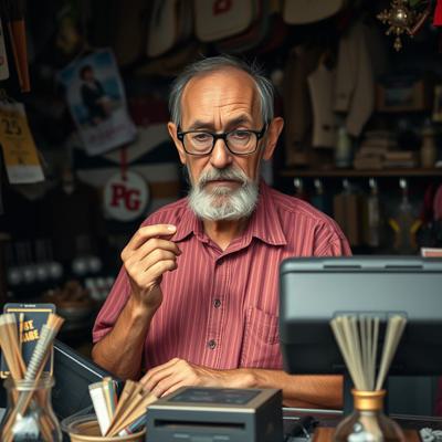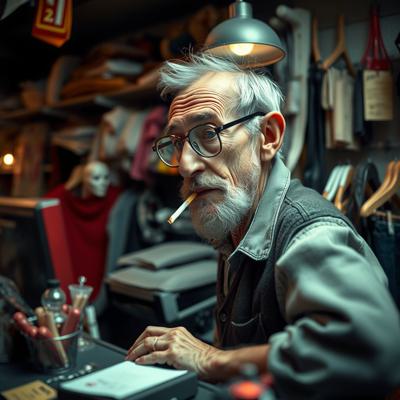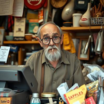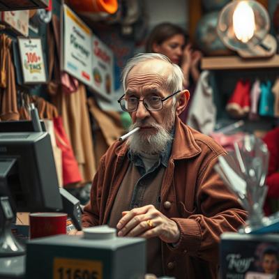 Убрать волосы, добавить сигарету [Уточнение для #6306832 'Худой старик заа кассовым аппаратом. Старые перекошенгый очки, небритый, седая короткая борода, сигарета. Вокруг товар женский секондхенд. ]'