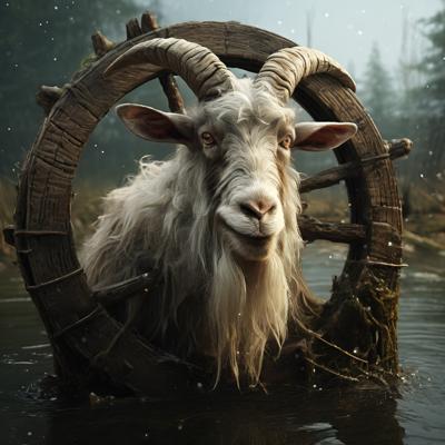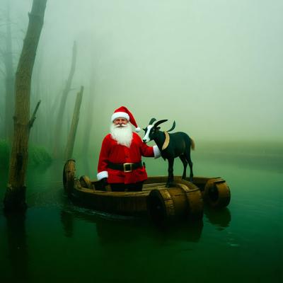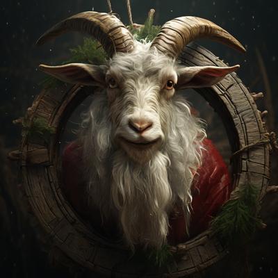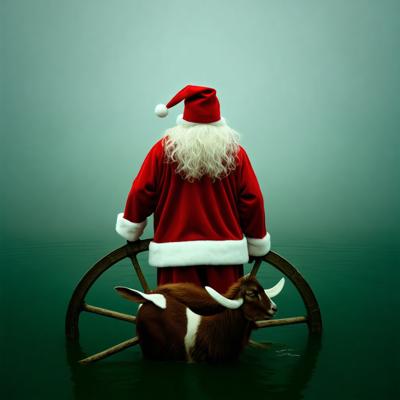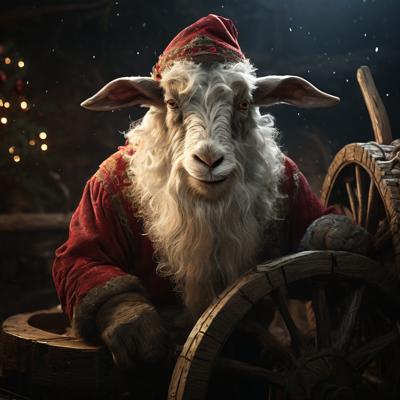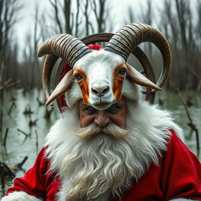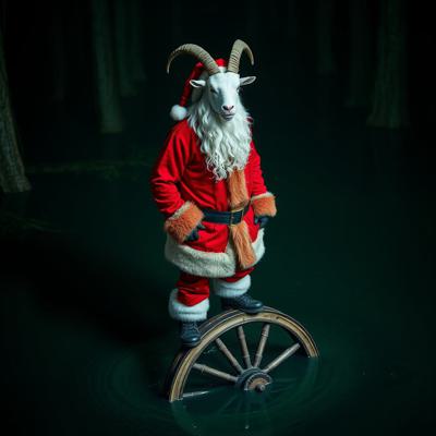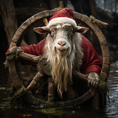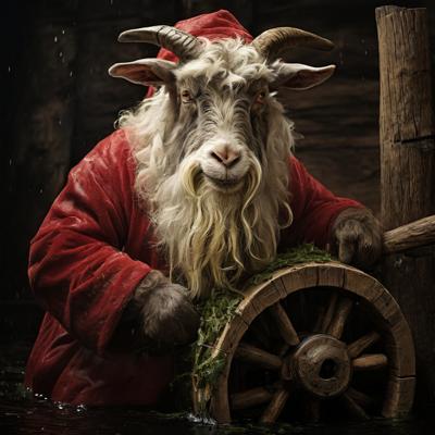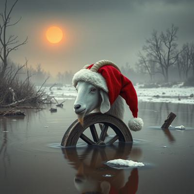 Голова деда мороза козла приделана на деревянное колесо болото